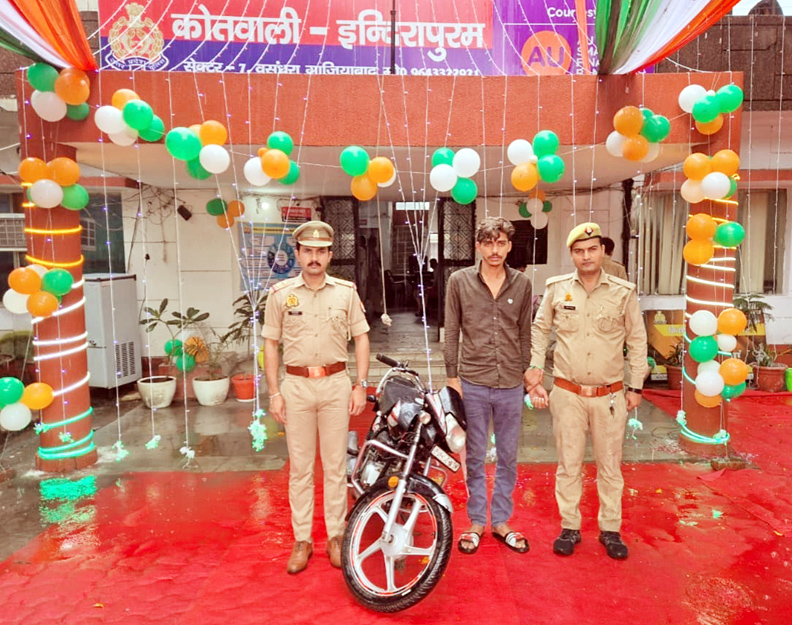 गाजियाबाद : पुलिस कमिश्नरेट गाजियाबाद के थाना इन्दिरापुरम पर 25 जुलाई 2025 को सोनू पुत्र राजेन्द्र निवासी अर्थला गाजियाबाद ने लिखित तहरीर दी और बताया कि अज्ञात व्यक्ति द्वारा मेरी मोटर साइकिल एचएफ डीलक्स साहिबाबाद पुल के पास वसुन्धरा क्षेत्र से चोरी कर ली गयी है। जिसके सम्बन्ध में धारा 303(2) बीएनएस के अन्तर्गत अभियोग पंजीकृत किया गया। जिसके क्रम में दिनांक 14/15 अगस्त की रात्रि को थाना इन्दिरापुरम पुलिस टीम द्वारा चेकिंग के दौरान मुखबिर की सूचना के आधार पर चोरी की घटना को कारित करने वाला 01 अभियुक्त आदित्य पुत्र महिपाल निवासी कुलेसरा संजय विहार कॉलोनी गौतमबुद्धनगर उम्र को साहिबाबाद रेलवे अण्डर पास के पास से चोरी की 01 मोटर साइकिल सहित गिरफ्तार किया गया। गिरफ्तार अभियुक्त पर धारा 303 (2) बीएनएस में धारा 317(2) बीएनएस की बढोत्तरी कर आवश्यक वैधानिक कार्यवाही की जा रही है।
