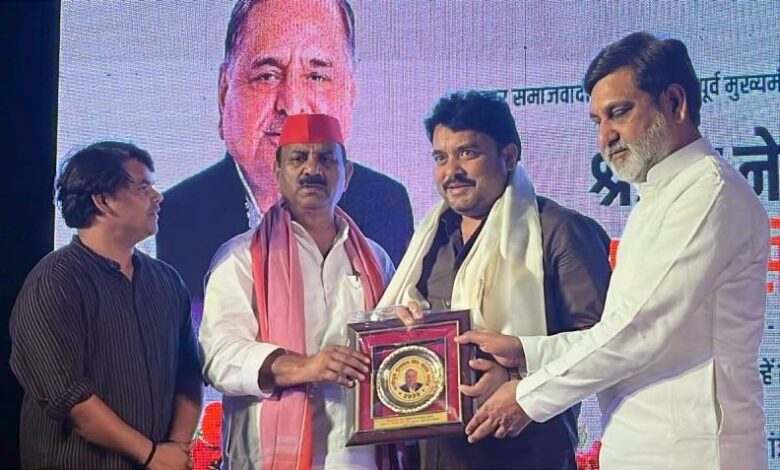 लखनऊ :आयरिश फिल्म क्रिएशन द्वारा लखनऊ में सम्मान समारोह का आयोजन किया गया। जिसमें गणमान्य जानों जिन्होंने समाज में विभिन्न क्षेत्रों में अपना योगदान दिया हैं, उन्हें धरतीपुत्र मुलायम सिंह यादव अवॉर्ड से सम्मानित किया गया।इसी क्रम में अभिनेता निर्माता संग्राम सिंह पटेल को भी यह सम्मान दिया गया।यह सम्मान संग्राम सिंह पटेल को उनके द्वारा भोजपुरी फिल्म उद्योग में योगदान के लिए दिया गया।उन्हें यह सम्मान समाजवादी पार्टी के प्रदेश अध्यक्ष श्यामलाल पाल के हाथों प्राप्त हुआ।जिसके लिए संग्राम सिंह पटेल ने धन्यवाद दिया एवं आभार जताया।