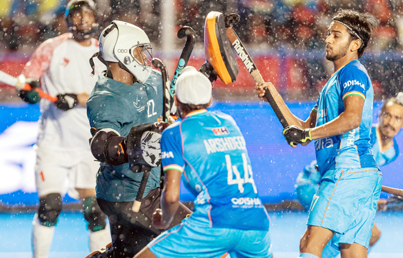 नई दिल्ली : आसमान से पूरे मैच में तेज पानी बरसा और मैदान पर भारतीय स्ट्राइकरों दिलराज सिंह, अर्शदीप सिंह और मनमीत सिंह के स्टिक से गोल बरसे रहे। दिलराज सिंह के हैट्रिक सहित चार तथा अर्शदीप सिंह व मनमीत सिंह की हैट्रिक की बदौलत भारत की टीम ओमान को एफआईएच जूनियर पुरुष हॉकी विश्व कप तमिलनाडु 2025 को चेन्नै में शुक्रवार को 17-0 से हरा कर लगातार दूसरी जीत के साथ कुल छह अंकों के साथ पूल बी में शीर्ष पर पहुंच गई। विजेता भारत के लिए गुरजोत सिंह व अजित यादव ने भी दो दो तथा लुआंग थोउनजम इम्बालेंगा, अनमोल एक्का , शारदा नंद तिवारी ने एक एक गोल किया। भारत ने भले ही 17 गोल दागे लेकिन उसके लिए अभी भी बड़ी चिंता शुक्रवार को मिले 19 में से मात्र चार को ही गोल में बदल पानारहा। चीफ कोच पी आर श्रीजेश चाहे कुछ भी कहे भारत को अपने ऑलराउंडर ्ट्राइकर ड्रैग फ्लिकर अरिजित सिंह हुंडल का कंधे में चोट से मौजूदा संस्करण से बाहर होना बहुत अखरा। भारत खासतौर पर मौजूदा चैपियन जर्मनी, बेल्जियम, अऑस्ट्रेलिया, सपेन औरफ्रांस जैसी मजबूत टीमों के खिलाफ इस तरह पेनल्टी कॉर्नर को गंवाना गवारा नहीं कर सकता है