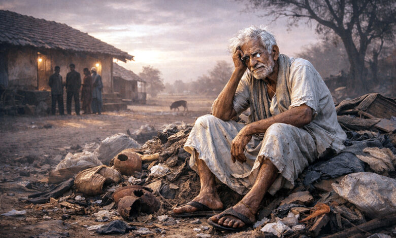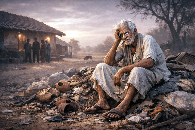 वे बोले,"देखो इस परमार्थी रामू की घरवाली को...! जब जायदाद जाके लडकों के नाम नहीं लिखी थी, तब-तक मेरी घी से चुपड़ी बातों से चिरौरी करती थीI अब मेरे घर से मोय निकाल रही है।कतई ईमान-धर्म नहीं रहा।दीनदयाल काका ने मुझे जो नसीहत दी थी,वह अक्षर-अक्षर सही निकली।मेरी ही मति मारी गई थी,जो मैंने तुमरी नसीहत नजरअंदाज कर दी।लेकिन अब इस कुलटा ने अपना असली रूप दिखा दिया।" रामू अभी तक घर की खिड़की से सब देख-सुन रहे थे।लेकिन अब पत्नी को कुलटा कह देने से उनके सब्र का बांध टूट गया।वे फुर्ती से बाहर आते हुए बोले,"लातों के भूत बातों से नहीं मानते।अब इसका मुहं काला करना ही पड़ेगा...।"और वे भोला पर टूट पड़े। असहाय भोला चिल्लाए,"देखो इस हरामजादे को कल तक अपनी वाचाल लुगाई को मेरे पास सुलाने में जाए लाज-शर्म नहीं आती थी।अब मुझ लाचार पर लात उठा रहा है।पापी कोड़ी होकर मरेगा...!" भोला के लांक्षण से रामू, उनकी पत्नी और बेटे तिलमिला गए।उन्होंने मिलकर भोला के हाथ-पैर पकड़कर घसीटा और गांव के बाहर घूरे पर छोड़ आए...।