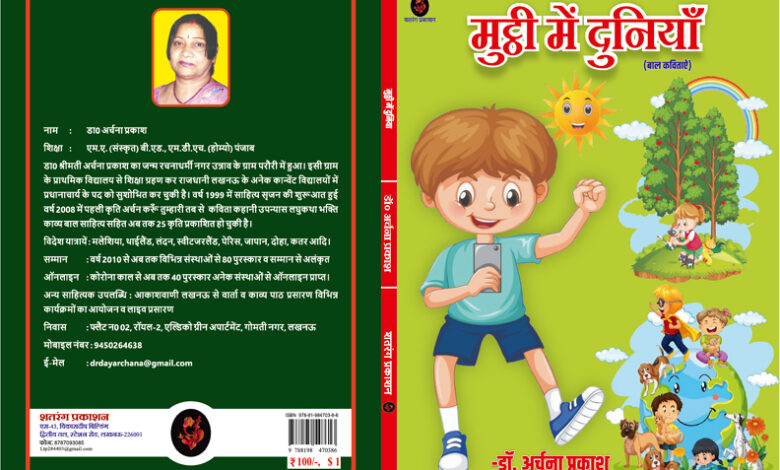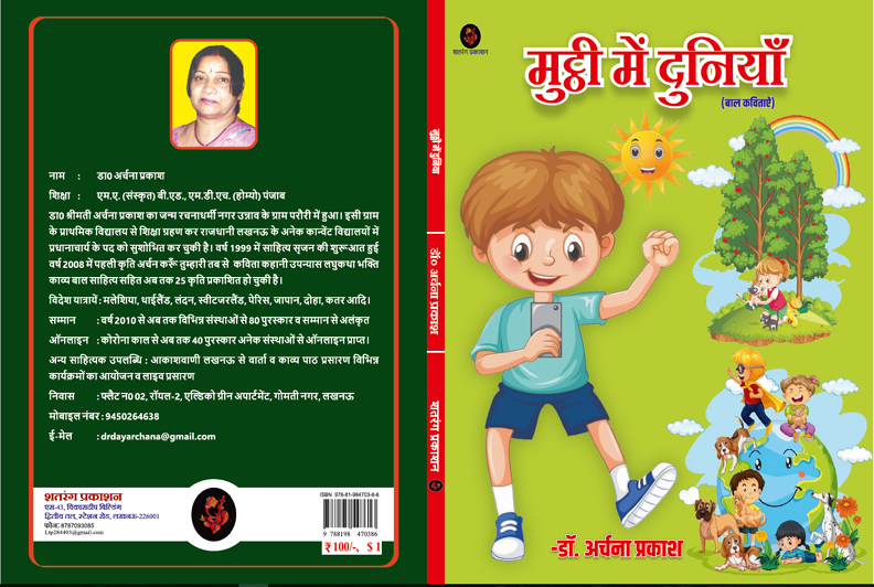 डा. अर्चना प्रकाश, द्वारा रचित ‘मुट्ठी में दुनियाँ’ एक प्रेरणादायक बाल कविता संग्रह है, जिसमें लगभग 20 कविताएं संकलित हैं। यह कृति बाल-मन की कोमल भावनाओं, कल्पनाशीलता और नैतिक चेतना को सहज और सजीव अभिव्यक्ति प्रदान करती है। कविताओं के माध्यम से लेखक ने प्रकृति, पर्यावरण, नैतिक मूल्य, राष्ट्रप्रेम, पारिवारिक स्नेह और परिश्रम जैसे महत्वपूर्ण विषयों को सरल और बालोपयोगी ढंग से प्रस्तुत किया है।जल,तितली,मौसम,वर्षा ऋतु,पेड़,गौरैया,नदियाँ जैसी कविताएं बच्चों को प्रकृति से जोड़ती हैं और उन्हें पर्यावरण संरक्षण के महत्व से परिचित कराती हैं। वहीं नववर्ष,मुट्ठी में दुनियाँ,स्वच्छता,बातें,दादी के लड्डू जैसी रचनाएं जीवन में सदाचार, त्याग और परिश्रम के मूल्य को सरल भाषा में समझाती हैं। ‘दिल्ली,हमारा देश,तिरंगा कविता बच्चों में राष्ट्रप्रेम और कर्तव्य-बोध की भावना जगाती है, जबकि ‘होली,ईश्वर,तारे जैसी कविताएं बाल-कल्पना की उड़ान और ईश्वरी सौंदर्य-बोध के प्रति विश्वास का बोध करती हैं।