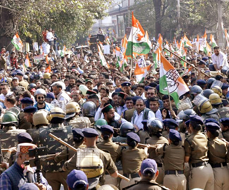 देहरादून : कांग्रेस कार्यकर्ताओं ने भाजपा सरकार की जनविरोधी नीतियों के विरोध में जमकर प्रदर्शन किया। कार्यकर्ताओं ने परेड ग्राउंड में एकत्रित होकर राजभवन घेराव के लिए कूच करते हुए भाजपा सरकार के खिलाफ नारेबाजी की। नेताओं ने कहा कि राज्य में कानून-व्यवस्था चरमरा चुकी है, भाजपा ने भ्रष्टाचार, व्यभिचार को सत्ता में रहने का हथियार बनाया है जिसे मिलकर जड़ से उखाड़ फेंकना है। उन्होंने कहा कि अगला कार्यक्रम इससे भी बड़ा होगा। जिसके लिए जोश और शक्ति के साथ-साथ जन सहयोग बनाए रखना जरूरी है। प्रदर्शन में प्रदेशभर के कार्यकर्ताओं ने भागीदारी की। राजभवन घेराव कार्यक्रम पूर्व प्रदेश अध्यक्ष प्रीतम सिंह के नेतृत्व में किया गया।