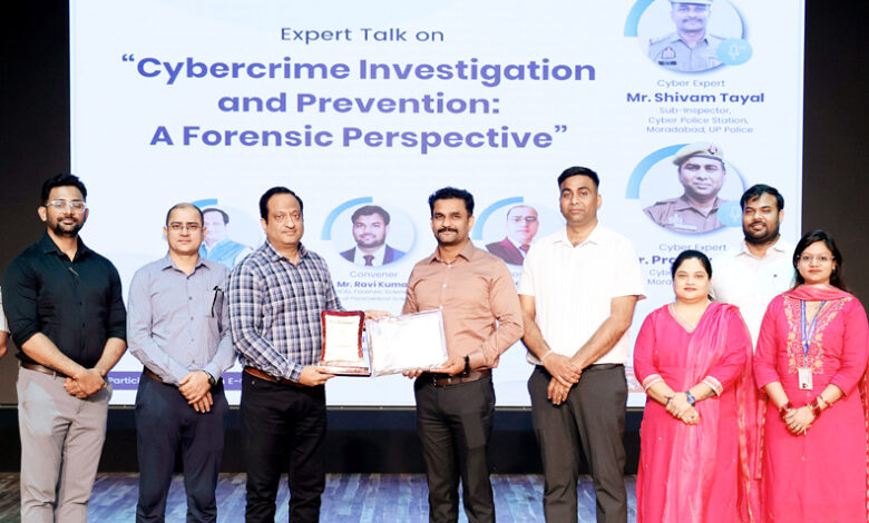 इससे पूर्व साइबर एक्सपर्ट श्री शिवम तायल, कॉलेज ऑफ लॉ एंड लीगल स्टडीज के डीन प्रो. हरबंश दीक्षित, तीर्थंकर महावीर मेडिकल कॉलेज एंड रिसर्च सेंटर के प्राचार्य प्रो. नवनीत कुमार, डॉ. सुशील कुमार, रेडियोइमेजिंग टेक्नोलॉजी की एचओडी डॉ. रुचि कांत, फॉरेंसिक साइंस के एचओडी श्री रवि कुमार आदि ने मां सरस्वती के समक्ष दीप प्रज्जवलन करके कार्यक्रम का शुभारम्भ किया। कॉलेज ऑफ लॉ के डीन प्रो. हरबंश दीक्षित ने साइबर अपराध के सामाजिक और न्यायिक प्रभावों पर प्रकाश डालते हुए कहा, साइबर अपराध के प्रति जागरूकता समाज के सुदृढ़ और सुरक्षित निर्माण के लिए अत्यंत आवश्यक है। उन्होंने बताया, न्याय प्रणाली केवल अपराधियों को दंडित करने तक सीमित नहीं है, बल्कि यह समाज में नैतिक मूल्यों और अनुशासन को स्थापित करने का कार्य भी करती है। साइबर एक्सपर्ट श्री प्रशांत सिंह ने वित्तीय लेन-देन से जुड़े साइबर अपराधों को लेकर सजगता की विस्तार से चर्चा की। प्रो. नवनीत कुमार ने स्टुडेंट्स को सचेत करते हुए कहा, डिजिटल माध्यमों का उपयोग करते समय छोटी-छोटी असावधानियां भी गंभीर परिणाम उत्पन्न कर सकती हैं, इसलिए सतर्कता और जागरूकता अत्यंत आवश्यक है। एचओडी श्री रवि कुमार ने सभी अतिथियों का आभार व्यक्त किया। डिपार्टमेंट ऑफ फॉरेंसिक मेडिसिन एंड टॉक्सिकोलॉजी के प्रो. प्रमोद डोडे, श्री अमित बिष्ट के संग-संग पैरामेडिकल साइंसेज के संग-संग लॉ कॉलेज और तीर्थंकर महावीर मेडिकल कॉलेज एंड रिसर्च सेंटर के स्टुडेंट्स मौजूद रहे।