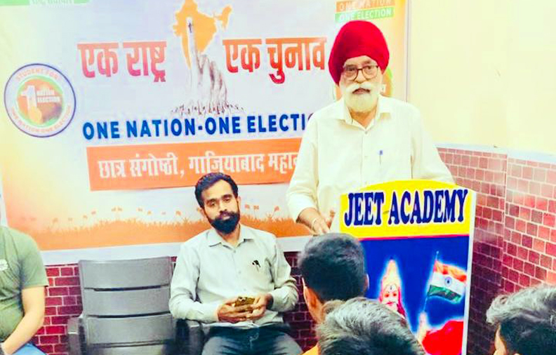 ग़ाज़ियाबाद : गाजियाबाद के गोविंदपुरम स्थित जीत एकेडमी में “वन नेशन वन इलेक्शन” विषय पर संगोष्ठी का आयोजन किया गया। कार्यक्रम में मुख्य अतिथि के रूप में अभियान के समन्वयक व पूर्व महानगर संयोजक सरदार एस. पी. सिंह जी उपस्थित रहे। उन्होंने युवाओं को मार्गदर्शन प्रदान करते हुए एक राष्ट्र एक चुनाव की आवश्यकता, इसके लाभ एवं भविष्य में देश की राजनीति पर इसके सकारात्मक प्रभावों पर विस्तृत प्रकाश डाला।उन्होंने बताया कि राष्ट्र की उन्नति व प्रगति के लिए एक राष्ट्र एक चुनाव को लागू करना केन्द्र सरकार की प्राथमिकता होनी चाहिए।