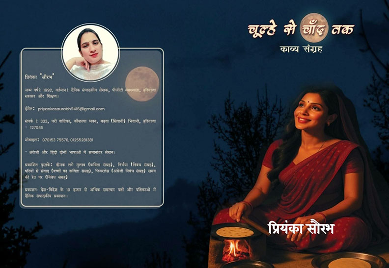 प्रियंका सौरभ का यह काव्य संग्रह ‘चूल्हे से चाँद तक’ केवल कविता नहीं, स्त्री आत्मा की यात्रा है। यह वह आवाज़ है, जिसे सदियों से दबाया गया, पर वह फिर भी जलती रही – रोटियों के साथ, परातों के बीच, और आँसुओं में घुली स्याही के माध्यम से।