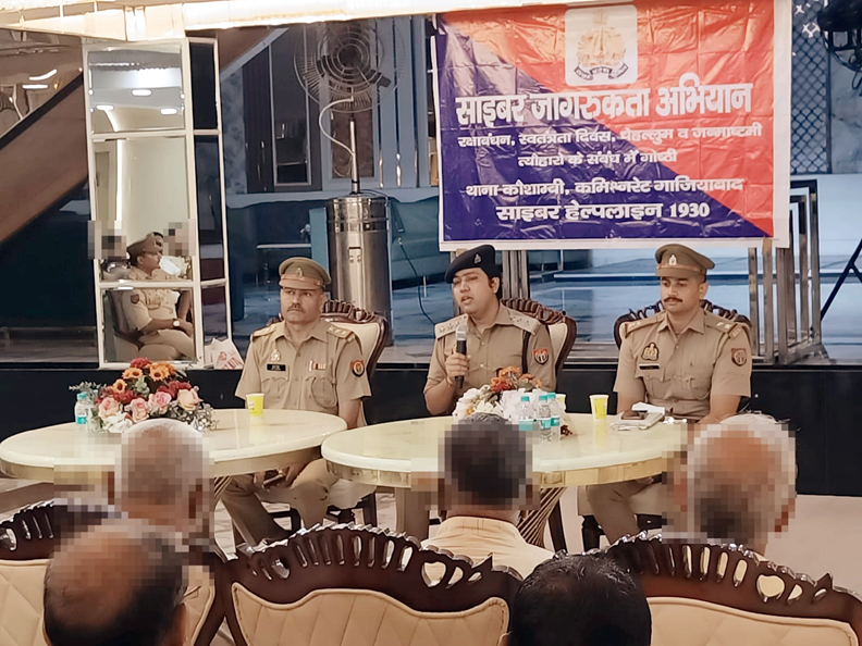 गाजियाबाद : पुलिस कमिश्नरेट गाजियाबाद के पुलिस आयुक्त जे. रविंदर गौड के निर्देशन में साइबर अपराधों की रोकथाम एवं नागरिकों को जागरूक करने हेतु साइबर जागरूकता अभियान सतत रूप से संचालित किया जा रहा है। इसी क्रम में 13 अगस्त 2025 को अभिषेक श्रीवास्तव सहायक पुलिस आयुक्त, इन्दिरापुरम, प्रभारी निरीक्षक थाना कौशाम्बी व पुलिस टीम द्वारा थाना कौशाम्बी क्षेत्रान्तर्गत स्थित केबीसी वैकेट हॉल व अतुल कुमार सिंह सहायक पुलिस आयुक्त, शालीमार गार्डन, प्रभारी निरीक्षक थाना शालीमार गार्डन व पुलिस टीम द्वारा थाना शालीमार गार्डन क्षेत्रान्तर्गत स्थित उत्सव हॉल में एक विशेष साइबर जागरूकता कार्यक्रम का आयोजन किया गया। कार्यक्रम का उद्देश्य वरिष्ठ नागरिकों, महिलाओं एवं नवयुवकों को आधुनिक साइबर अपराधों की पहचान करने, संभावित खतरों से स्वयं को सुरक्षित रखने तथा साइबर सुरक्षा के प्रति समाज में जागरूकता का प्रसार करना था। उक्त कार्यक्रम में शिक्षार्थियों, शिक्षकों एवं अन्य नागरिकों को बताया गया कि किसी भी संदिग्ध साइबर गतिविधि या ऑनलाइन ठगी की स्थिति में तुरंत 1930 पर कॉल करें या cybercrime.gov.in पर ऑनलाइन शिकायत दर्ज करें ।