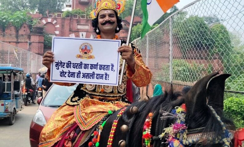 मुंगेर : बिहार विधानसभा आम निर्वाचन 2025 के अंतर्गत मुंगेर में स्वतंत्र, निष्पक्ष एवं शांतिपूर्ण वातावरण में चुनाव संपन्न कराने तथा मुंगेर में मतदान प्रतिशत को बढ़ाने को लेकर गांधी चौक में स्वीप कार्यक्रम के अंतर्गत नैतिक मतदान हेतु रैली निकाली गई एवं शपथ दिलाया गया। इतिहास के किरदार कर्ण को जीवंत करने के लिए मैदान में उतरे इलेक्शन कमिशन ऑफ इंडिया के आइकॉन राजन कुमार ने दानवीर कर्ण के अवतार में उन्होने लोगों को मतदान के लिए किया जागरूक किया।इस का आयोजन मुंगेर मंच द्वारा किया गया,जिसकी जोर शोर से तैयारी चल रही थी।