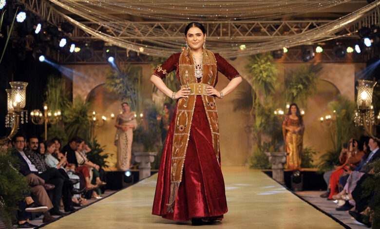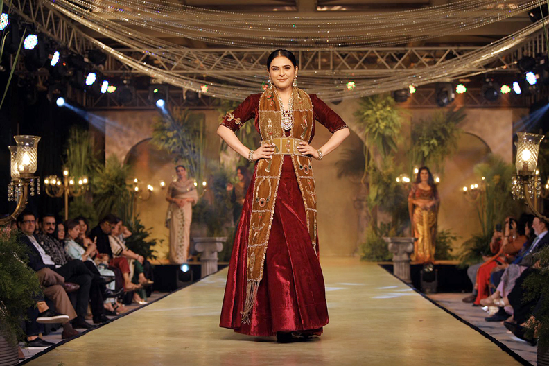 गहरे मैरून वेलवेट आउटफिट में सजी मधुरिमा का लुक शाही होने के साथ-साथ बेहद संतुलित और सांस्कृतिक जुड़ाव लिए हुए था। कढ़ाईदार स्टोल, स्ट्रक्चर्ड बेल्ट और सधी हुई ज्वेलरी ने उनके व्यक्तित्व को और निखारा। लेकिन उनके लुक से कहीं ज्यादा प्रभावशाली था उनका शांत आत्मविश्वास। रैंप पर उनकी सहज चाल और संयमित भावों ने हर किसी का ध्यान खींचा।