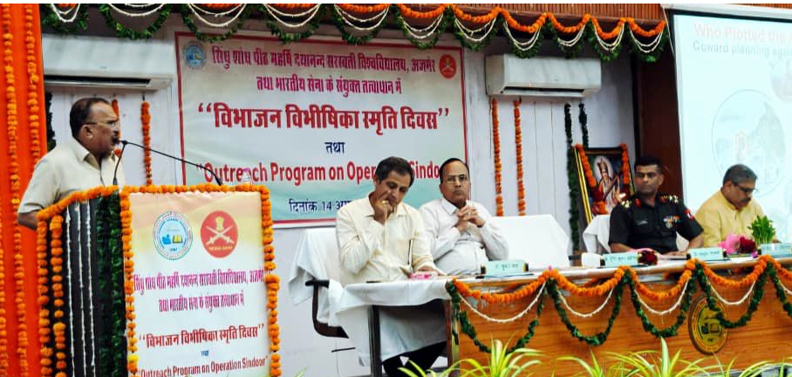 महर्षि दयानन्द सरस्वती विश्वविद्यालय, अजमेर द्वारा 14 अगस्त को भारत के विभाजन विभीषिका स्मृति दिवस को राष्ट्रीय एकता के संकल्प के रूप में मनाया गया। यह कार्यक्रम विश्वविद्यालय के सिंधुशोध पीठ एवं भारतीय सेना के संयुक्त तत्वावधान में आयोजित किया गया।इस अवसर पर मुख्य अतिथि राजस्थान विधानसभा अध्यक्ष श्री वासुदेव देवनानी ने विभाजन को भारतीय उपमहाद्वीप के इतिहास का एक दर्दनाक और संवेदनशील अध्याय बताते हुए प्रधानमंत्री द्वारा विभाजन विभीषिका दिवस मनाने के निर्णय का स्वागत किया। उन्होंने कहा कि यह स्मृतियां भविष्य की पीढ़ियों को सतर्क और एकजुट रहने की प्रेरणा प्रदान करती हैं। उन्होंने विद्यार्थियों से देश में निर्मित वस्तुओं के उपयोग, सेना और नेतृत्व पर भरोसा रखने तथा समाज को विभाजित करने वाली किसी भी शक्ति के विरुद्ध खड़े होने का दृढ़ निश्चय करने का आह्वान किया।