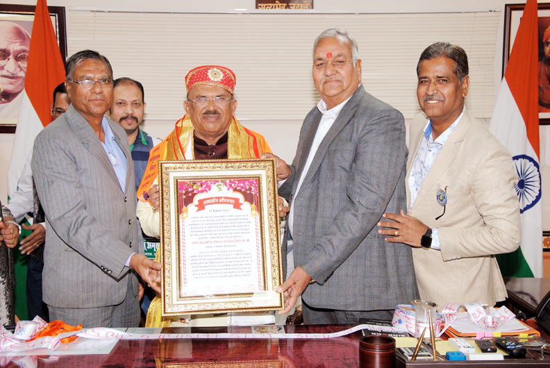 जयपुर : राजस्थान विधानसभा अध्यक्ष वासुदेव देवनानी का बुधवार को यहां विधान सभा में उदयपुर की स्वंयसेवी संस्थाओं ने मेवाडी पगडी व दुपट्टा पहनाकर, शॉल ओढाकर और आकाशीय अभिनन्दन पत्र भेंट कर अभिनन्दन किया। अभिनन्दन पत्र में उल्लेख किया गया है कि राजस्थान विधान सभा के अध्यक्ष वासुदेव देवनानी प्रदेश के प्रमुख राजनीतिज्ञ और अजमेर उत्तर से 2003 से लगातार विधायक पद पर निर्वाचित होने का रिकार्ड हासिल करने वाले शिक्षाविद, मंगलमैत्री के अनुयायी, करुणा के सागर, सामाजिक कार्यों के प्रणेता, वाक शैली और बुद्धि चातुर्य के पर्याय, सेवा व कर्तव्य के आयाम स्थापित करने वाले राजनीति के सशक्त हस्ताक्षर और सहज, सौम्य व्यक्तित्व व गहन चिन्तन के कीर्ति स्तम्भ है।