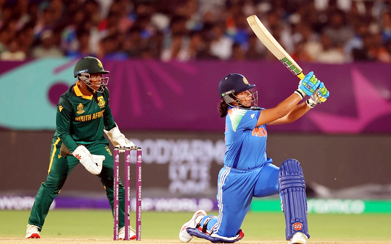 आठवें नंबर पर बल्लेबाजी के लिए उतरने वाली ऋचा घोष के मात्र 77 गेंदों पर चार छक्कों और 11 चौकों की मदद से भारत नेछह विकेट मात्र 102 रन गंवाने के बाद अमनजोत कौर (13 रन, 44 गेंद, एक चौका) के साथ सातवें विकेट की 51 और स्नेह राणा (33 रन, 24 गेंद, छह चौके) के साथ आठवें विकेट की 88 रन की भागीदारी की बदौलत भारत की टीम पहले बल्लेबाजी के लिए बुलाए जाने पर 49.5 ओवर में 251 रन का चुनौतीपूर्ण स्कोर बना कर आउट हो गई। ऋचा पारी के 50 वें व अतिम ओवर और तेज गेंदबाज नेडीन क्लार्क की गेंद को उड़ाने की कोशिश में ट्रोयन को लॉन्ग ऑन पर कैच थमा दिया और भारत ने नौवां विकेट गंवा दिया और अगली गेंद पर श्रीचारिणी ने कप्तान लॉरा वाल्वार्ट को कैच थमा दिया। इससे पहले स्नेह राणा ने तेज गेंदबाज मरियन कैप की गेंद को उड़ाने की कोशिश में वॉलफर्ट को कैच थमा दिया और भारत ने आठवां विकेट 241 रन पर खो दिया। बाएं हाथ की स्पिनर चोल ट्रोयन(3/32) दक्षिण अफ्रीका की सबसे कामयाब गेंदबाज रही जबकि बाएं हाथ की स्पिनरनोनकूलूलेको मलाबा,तेज गेंदबाज मरियानी कैप व नेडीन क्लार्क ने दो दो विकेट चटकाए।