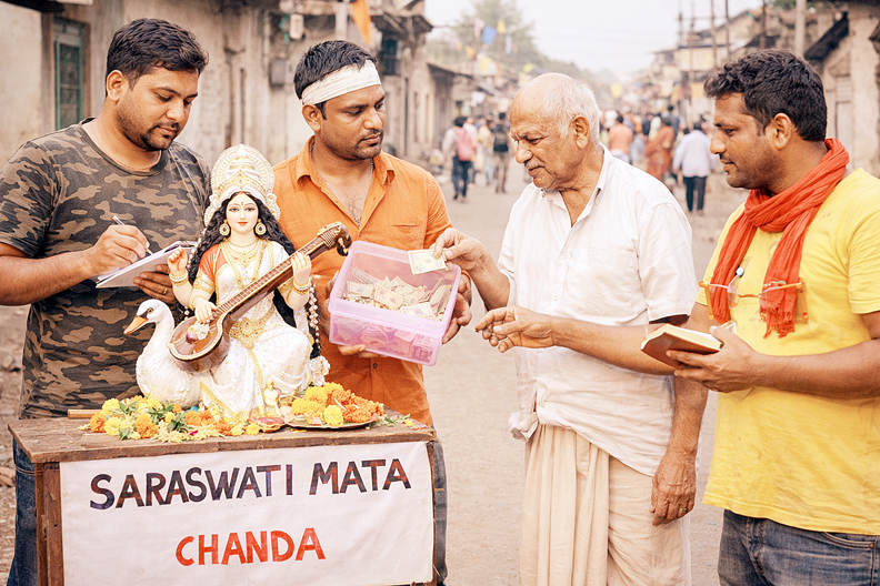 सरस्वती पूजा के नाम पर इन भक्तों की कार्यकुशलता अद्भुत होती है। चंदा वसूली, पंडाल निर्माण, डेकोरेशन, प्रसाद वितरण और हिसाब-किताब में इनका कौशल किसी चार्टर्ड अकाउंटेंट से कम नहीं होता—बस फ़र्क इतना है कि अंकेक्षण-रहित हिसाब हमेशा गोल-मोल रहता है। पूरे वर्ष निठल्ला घूमने वाले इन युवकों की व्यस्तता वसंत पंचमी के पखवाड़े में मार्च क्लोज़िंग से प्रभावित सार्वजनिक क्षेत्र के बैंककर्मियों की तरह बढ़ जाती है।