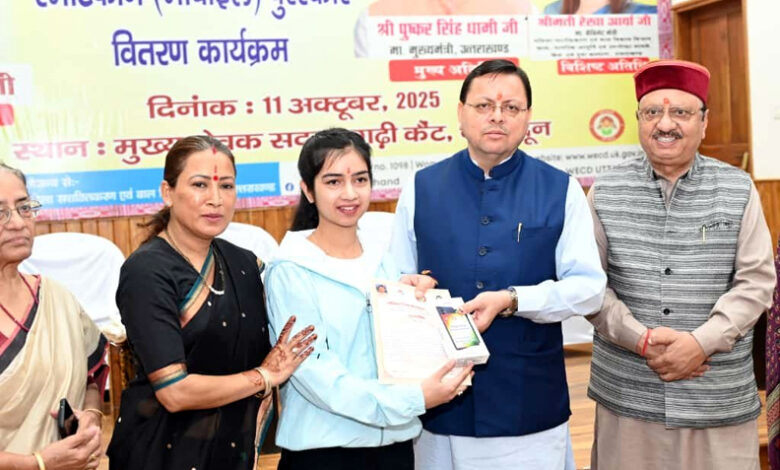 देहरादून : मुख्यमंत्री कैम्प कार्यालय स्थित मुख्य सेवक सदन में अंतरराष्ट्रीय बालिका दिवस के अवसर पर बालिका शिक्षा प्रोत्साहन कार्यक्रम आयोजित किया गया। महिला सशक्तिकरण एवं बाल विकास विभाग द्वारा आयोजित इस कार्यक्रम में 326 मेधावी बालिकाओं को स्मार्टफोन प्रदान किए गए। जनपद स्तर पर हाईस्कूल एवं इंटरमीडिएट की परीक्षा के प्रथम तीन टॉपर बालिकाओं एवं विकासखण्ड स्तर पर टॉपर बालिकाओं को मुख्यमंत्री द्वारा पुरस्कृत किया गया।