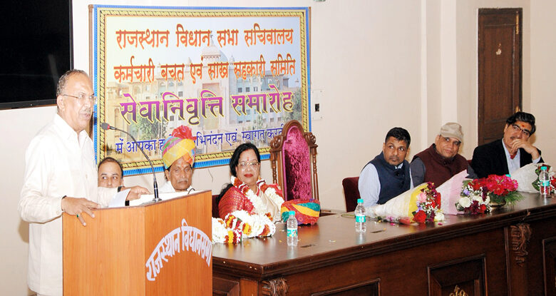 विधानसभाध्यक्ष श्री देवनानी बुधवार को सांय विधान सभा में विधानसभा की संपादक (मुद्रण) श्रीमती आशा शर्मा और सहायक कर्मचारी श्री रामेश्वर सैन के सेवानिवृत्ति समारोह को सम्बोधित कर रहे थे। श्री देवनानी ने साफा एवं पगड़ी पहनाकर, शॉल ओढाकर और स्मृति चिन्ह भेंट कर श्रीमती शर्मा और श्री सैन का अभिनन्दन किया और उन्हें भावभीनी विदाई दी।