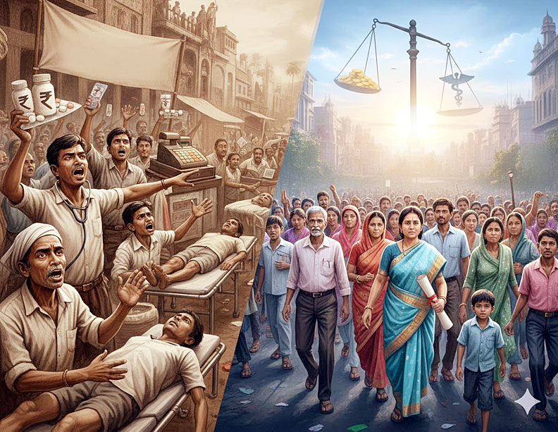 भारत में स्वास्थ्य सेवाओं की दिशा और ढांचा तेजी से बदल रहा है। चिकित्सा उपचार, जो कभी सार्वजनिक दायित्व और कल्याणकारी राज्य की बुनियादी जिम्मेदारी माना जाता था, अब अधिकाधिक निजी क्षेत्र के हाथों में जाता दिख रहा है। एक ओर, सरकारी स्वास्थ्य ढांचा सीमित बजट, कम मानव संसाधन और कमजोर बुनियादी ढांचे से जूझता रहता है; दूसरी ओर, निजी अस्पतालों और कॉर्पोरेट मेडिकल चेन की पहुंच और प्रभाव लगातार बढ़ रहा है। इन दोनों के बीच आम नागरिक, विशेषकर गरीब, ग्रामीण, दलित, आदिवासी, अल्पसंख्यक और हाशिए पर रहने वाले समुदाय, स्वास्थ्य सेवाओं की बढ़ती लागत और असमान पहुंच के बोझ तले दबते जा रहे हैं।