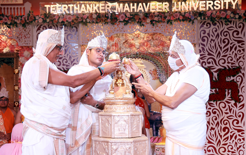 तीर्थंकर महावीर यूनिवर्सिटी, मुरादाबाद में उत्तम ब्रह्मचर्य धर्म दिवस एवम् भगवान वासुपूज्य मोक्षकल्याणक महोत्सव पर रिद्धि-सिद्धि भवन में विधि-विधान से विश्व शांति यज्ञ हुआ। प्रतिष्ठाचार्य श्री ऋषभ जैन शास्त्री के सानिध्य में पंच परमेष्टि पूजन, समुच्चय चौबीसी जिन पूजा, चंद्रप्रभु भगवान पूजन, श्री वसुपूज्य जिन पूजा, अनंतनाथ भगवान जिन पूजा, दशलक्षण पूजा, रत्न त्रय पूजा, सम्यक दर्शन पूजा का अर्घ्य, सम्यक ज्ञान पूजन हुए। फर्स्ट लेडी श्रीमती वीना जैन ने निर्वाण कांड पढ़ा, जबकि तत्वार्थ सूत्र के अंतिम अध्याय का वाचन श्रीमती ऋचा जैन ने किया। जीवीसी श्री मनीष जैन ने अभिषेक और शांतिधारा करने वाले श्रावक-श्राविकाओं, जबकि ईडी श्री अक्षत जैन ने भोजन व्यवस्था करने वालों को सम्मानित किया। निर्जल उपवास रखने वाले श्रावक-श्राविकाओं को भी श्रीमती ऋचा जैन ने सम्मानित किया। श्रीमती अंजलि सिंघई, श्रीमती निकिता जैन, श्रीमती आरती जैन, डॉ. नम्रता जैन ने अष्ट कुमारियों का सम्मान किया। संग-संग लाडु निर्माण करने वाले श्रावक- श्री सौम्य जैन को सम्मानित किया। साथ ही ब्रहमचारिणी डॉ. कल्पना जैन, भोपाल की सचिन जैन एंड पार्टी, प्रतिष्ठाचार्य श्री ऋषभ जैन शास्त्री, डिजिटल मार्केटिंग के अंकित जैन आदि को भी सम्मानित किया गया। दूसरी ओर 07 सितंबर रविवार को टीएमयू के कुलाधिपति श्री सुरेश जैन के आवास- संवृद्धि पर सुबह सात बजे से पारणा होगा, जिसमें जैन फैकल्टीज़ के संग-संग श्रावक-श्राविकाएं शामिल होंगे, जबकि शनिवार की देर शाम को रिद्धि-सिद्धि भवन में 1008 दीपों से महाआरती होगी।